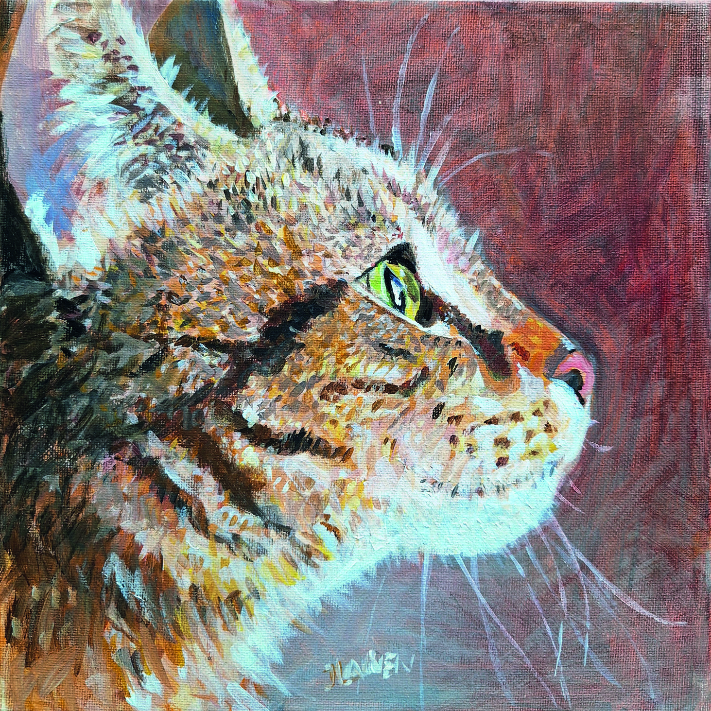 Deze collectie bestaat uit poezen, honden en vogels. Afmeting: 2 0  x  2 0 cm, geschilderd op een linnen paneeltje.
