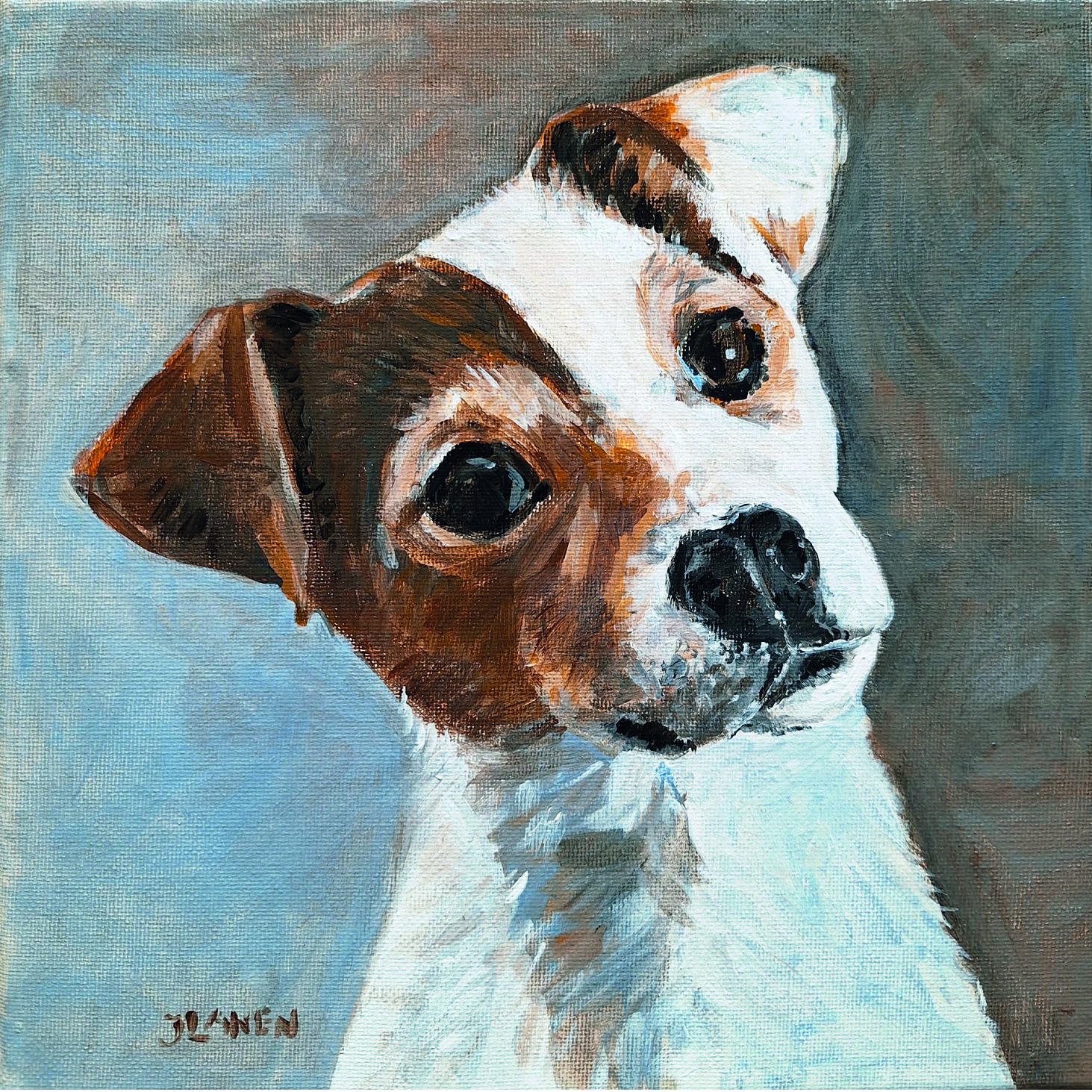 Deze collectie bestaat uit poezen, honden en vogels. Afmeting: 2 0  x  2 0 cm, geschilderd op een linnen paneeltje.